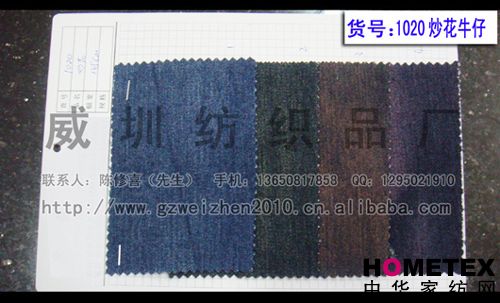織物組織:平紋 幅寬:150cm 品名:滌棉牛仔 密度:64*47 水洗工藝:砂洗 貨號:1020炒花 重量:* 具體用途:休閑服、工作服、褲裝、時裝 別名:1020炒花 印染工藝:印花 成分及含量:65%棉,30%滌,5%氨綸 主要用途:服裝用布 ======================================================================= 以上產品全部現貨供應,可隨時提供樣布卡和現貨,隨時發貨。所有產品全部是廠家直銷價,我們承諾:以超低利潤營銷,我 們只求銷售量。為保證您的利益,我司建議您在采購前先確認我們的品質樣與顏色樣后再拿大貨,期待與您的真誠合作。因產 品種類較多,具體參考未盡詳盡,如有需要,請您與我們聯系。 瑞豐紡織(中大旗艦店)坐落于國內最大的紡織面料產業中心—廣州中大,是一家專業銷售面料的廠家直銷商。主要經 營產品有:全棉凈色、仿記憶絲面料、全棉(TC)色織等,面料品種花達上千余種,所有產品全部現貨經營。 我們面料的品質來源于:1、采用國內外優質的原材料;2、使用精良的生產工藝和設備;3、完善的生產質量管理體系。我 們具有開發和創新品種的強烈意識和優越條件,并根據客戶需求與市場變化時時推出潮流面料。憑著多年的專業行業經驗,根 據客戶需求,不論客戶在全國任何地方,只要提供小樣,就可在一兩天時間內輕松獲得所需面料的信息。 批發說明供應商支持混批 。 ============================================================= 有意請加QQ:1295021910或電話聯系。 公司名稱:威圳紡織品廠 聯系人:陳修喜先生 手機:13650817858 網址:http://www.gzweizhen2010.cn.alibaba.com =============================================================