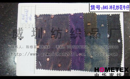 幅寬:150cm 品名:滌棉牛仔 密度:64*47 貨號(hào):B45沖孔炒花 重量:* 具體用途:休閑服、工作服、褲裝、時(shí)裝 別名:B45沖孔炒花 成分及含量:65%棉,35%滌 主要用途:服裝用布 ======================================================================= 以上產(chǎn)品全部現(xiàn)貨供應(yīng),可隨時(shí)提供樣布卡和現(xiàn)貨,隨時(shí)發(fā)貨。所有產(chǎn)品全部是廠家直銷(xiāo)價(jià),我們承諾:以超低利潤(rùn)營(yíng)銷(xiāo),我 們只求銷(xiāo)售量。為保證您的利益,我司建議您在采購(gòu)前先確認(rèn)我們的品質(zhì)樣與顏色樣后再拿大貨,期待與您的真誠(chéng)合作。因產(chǎn) 品種類較多,具體參考未盡詳盡,如有需要,請(qǐng)您與我們聯(lián)系。 瑞豐紡織(中大旗艦店)坐落于國(guó)內(nèi)最大的紡織面料產(chǎn)業(yè)中心—廣州中大,是一家專業(yè)銷(xiāo)售面料的廠家直銷(xiāo)商。主要經(jīng) 營(yíng)產(chǎn)品有:全棉凈色、仿記憶絲面料、全棉(TC)色織等,面料品種花達(dá)上千余種,所有產(chǎn)品全部現(xiàn)貨經(jīng)營(yíng)。 我們面料的品質(zhì)來(lái)源于:1、采用國(guó)內(nèi)外優(yōu)質(zhì)的原材料;2、使用精良的生產(chǎn)工藝和設(shè)備;3、完善的生產(chǎn)質(zhì)量管理體系。我 們具有開(kāi)發(fā)和創(chuàng)新品種的強(qiáng)烈意識(shí)和優(yōu)越條件,并根據(jù)客戶需求與市場(chǎng)變化時(shí)時(shí)推出潮流面料。憑著多年的專業(yè)行業(yè)經(jīng)驗(yàn),根 據(jù)客戶需求,不論客戶在全國(guó)任何地方,只要提供小樣,就可在一兩天時(shí)間內(nèi)輕松獲得所需面料的信息。 批發(fā)說(shuō)明供應(yīng)商支持混批 。 ============================================================= 有意請(qǐng)加QQ:1295021910或電話聯(lián)系。 公司名稱:威圳紡織品廠 聯(lián)系人:陳修喜先生 手機(jī):13650817858 網(wǎng)址:http://www.gzweizhen2010.cn.alibaba.com =============================================================