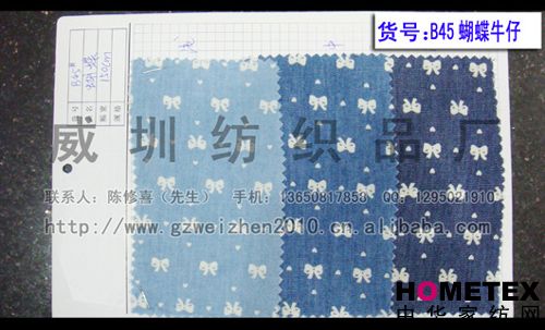 織物組織:平紋 幅寬:150cm 品名:滌棉牛仔 密度:64*47 水洗工藝:砂洗 貨號:B45蝴蝶 重量:* 具體用途:襯衫、休閑服、工作服、褲裝、時裝 別名:B45蝴蝶 印染工藝:印花 成分及含量:65%棉,35%滌 主要用途:服裝用布 ======================================================================= 以上產品全部現貨供應,可隨時提供樣布卡和現貨,隨時發貨。所有產品全部是廠家直銷價,我們承諾:以超低利潤營銷,我 們只求銷售量。為保證您的利益,我司建議您在采購前先確認我們的品質樣與顏色樣后再拿大貨,期待與您的真誠合作。因產 品種類較多,具體參考未盡詳盡,如有需要,請您與我們聯系。 瑞豐紡織(中大旗艦店)坐落于國內最大的紡織面料產業中心—廣州中大,是一家專業銷售面料的廠家直銷商。主要經 營產品有:全棉凈色、仿記憶絲面料、全棉(TC)色織等,面料品種花達上千余種,所有產品全部現貨經營。 我們面料的品質來源于:1、采用國內外優質的原材料;2、使用精良的生產工藝和設備;3、完善的生產質量管理體系。我 們具有開發和創新品種的強烈意識和優越條件,并根據客戶需求與市場變化時時推出潮流面料。憑著多年的專業行業經驗,根 據客戶需求,不論客戶在全國任何地方,只要提供小樣,就可在一兩天時間內輕松獲得所需面料的信息。 批發說明供應商支持混批 。 ============================================================= 有意請加QQ:1295021910或電話聯系。 公司名稱:威圳紡織品廠 聯系人:陳修喜先生 手機:13650817858 網址:http://www.gzweizhen2010.cn.alibaba.com =============================================================