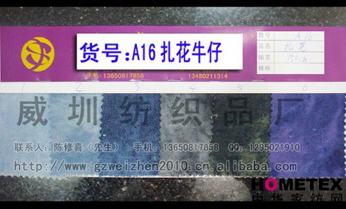 織物組織:平紋 幅寬:150cm 品名:滌棉牛仔 密度:64*47 水洗工藝:砂洗 貨號:A16扎花 重量:* 具體用途:休閑服、工作服、褲裝、時裝 別名:A16扎花 印染工藝:印花 成分及含量:75%棉,25%滌 主要用途:服裝用布 ======================================================================= 以上產品全部現貨供應,可隨時提供樣布卡和現貨,隨時發貨。所有產品全部是廠家直銷價,我們承諾:以超低利潤營銷,我 們只求銷售量。為保證您的利益,我司建議您在采購前先確認我們的品質樣與顏色樣后再拿大貨,期待與您的真誠合作。因產 品種類較多,具體參考未盡詳盡,如有需要,請您與我們聯系。 瑞豐紡織(中大旗艦店)坐落于國內最大的紡織面料產業中心—廣州中大,是一家專業銷售面料的廠家直銷商。主要經 營產品有:全棉凈色、仿記憶絲面料、全棉(TC)色織等,面料品種花達上千余種,所有產品全部現貨經營。 我們面料的品質來源于:1、采用國內外優質的原材料;2、使用精良的生產工藝和設備;3、完善的生產質量管理體系。我 們具有開發和創新品種的強烈意識和優越條件,并根據客戶需求與市場變化時時推出潮流面料。憑著多年的專業行業經驗,根 據客戶需求,不論客戶在全國任何地方,只要提供小樣,就可在一兩天時間內輕松獲得所需面料的信息。 批發說明供應商支持混批 。 ============================================================= 有意請加QQ:1295021910或電話聯系。 公司名稱:威圳紡織品廠 聯系人:陳修喜先生 手機:13650817858 網址:http://www.gzweizhen2010.cn.alibaba.com =============================================================