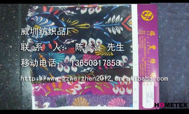 織物組織:平紋 幅寬:155cm 品名:針織仿麻 密度:240t 染整工藝:印花 貨號:548 克重:90(g/㎡) 具體用途:休閑服、工作服、棉服、羽絨服、褲裝、時裝、運動服、戶外服、里布 別名:548 成分及含量:100%T 主要用途:服裝用布 紗支:32 ============================================================= 有意請加QQ:1295021910或電話聯系。 公司名稱:威圳紡織品廠 聯系人:陳修喜先生 手機:13650817858 網址:http://www.gzweizhen2010.cn.alibaba.com =============================================================